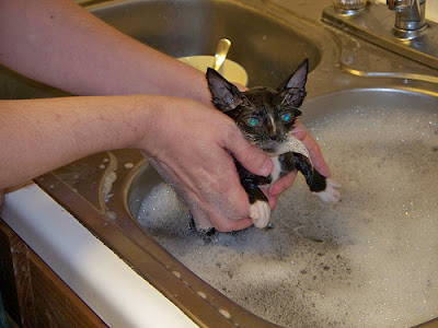 10 - Una alternativa para gatos completamente imposibles de mojar por completo consiste en echarles un recipiente con agua tibia sobre el animal sin tocar la cabeza, así sentirá menos pánico. La cabeza podemos limpiársela después con un paño humedecido con agua. En estos casos difíciles es buena idea sujetarlos por el cuello con una de las dos manos, como hacía su madre cuando era un baby cat ; )